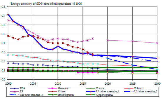 Such a comparison of the integrated index with the integrated thresholds determines the strategic scenarios of sustainable development in the medium term, for example, until 2030. Thus, for every year we know the desired values of the integral index. The task of strategizing is to solve the inverse problem: at a given value of the integrated index to find the values of components and indicators that provide the desired value of the integrated index, i.e., to do strategic energy security planning applying the principle “the future is determined by trajectory into the future” [29] (pp. 86–92) rather than the classical forecasting principle, “the past determines the future”.