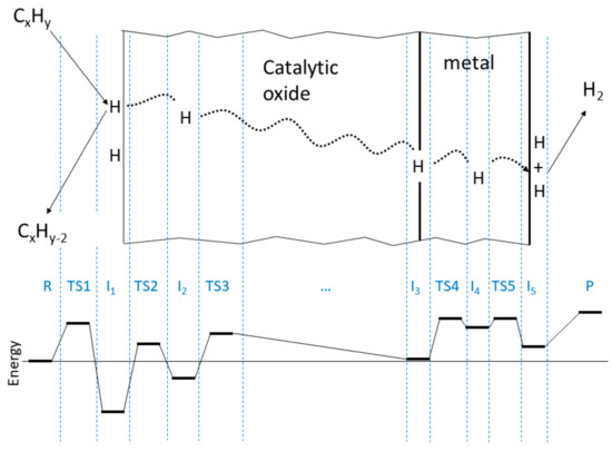 In step 1, reactant (R) interacts with the catalyst surface, producing one or more adsorbed H atoms (I1) and possibly an unsaturated hydrocarbon byproduct (CxHy−2, denoted U in the balance of this paper.) The energy barrier to this process is ().