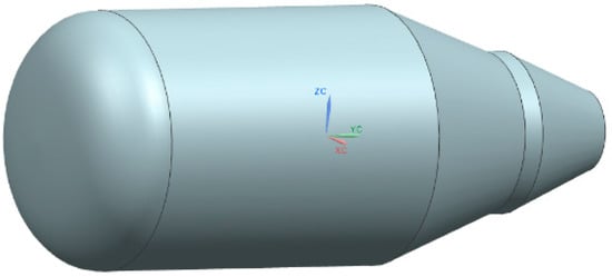 Experiments were performed in closed vessels of 0.02 m3, 1 m3, and 6 m3 volume, experiments in 1 and 6 m3 volume were conducted at the Experimental Mine Barbara of Central Mining Institute, Poland. The spherical 0.02 m3 vessel is described in detail in standard EN 15967. Ignition was initiated by electric spark in the center of the volume. The ignition energy was in the range of 10–20 J according to the spark generation methodology described in EN 15,967 standard. The 1 m3 vessel shape (L/D is close to1) was composed of a cylindrical part of diameter 1.1 m and convex sides fitted with flat closing lids. The 3D model of the 1 m3 vessel fluid volume is presented in Figure 2. The spark plug was used as the ignition source placed in the center of the tank. More detailed information about the 1 m3 vessel might be found in [24]. The 6 m3 vessel (L/D ≈ 2.5) was composed of a cylindrical part of 1600 mm in diameter closed by semi-spherical-like bottom at one side and extendable, conical shape parts closed with a flat lid. The 3D drawing of the vessel volume is presented in Figure 3. Ignition source was electrical spark placed in the geometrical center of the cylindrical part.