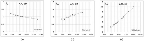 Leading point factor ΞLP (effect of preferential diffusion) [23] for: (a) CH4–air, (b) C2H6–air, and (c) C3H8–air.