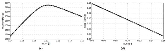 Example input data calculated with Cantera: (a) adiabatic flame temperature, (b) expansion ratio, (c) heat of combustion, and (d) unburned mixture density (solid lines) as a function of CH4 fraction in air. Cantera generated data with 1–6th order polynomial fit curve (dashed lines). Data generated for initial temperature 293 K and pressure 1.01325 bar.