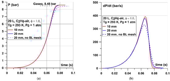 Influence of the mesh size and boundary layer mesh at wall on the: (a) pressure and (b) dP/dt traces for stoichiometric C2H6–air mixture at standard conditions. Gaseq line shows the theoretical pressure under constant volume combustion conditions.