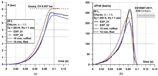 The following graphs show the comparison between experimental and numerical results of pressure and pressure dynamics (dP/dt) for cases with and without radiation in the model. The (dP/dt)max values were often used to assess the explosion severity of particular mixture and to design adequate mitigation techniques, e.g., venting devices. The (dP/dt)max parameter is also provided in standard EN 15,967 for a variety of experimental vessels volume to verify the performance of an experimental apparatus. The (dP/dt)max value provided for methane–air in 20 L sphere at stoichiometric concentration and initial conditions of 25 °C and 0.1 MPa was equal to 235 ± 7.4 bar/s. On each pressure–time graph theoretical value of maximum pressure under constant volume combustion conditions was presented. The match of this theoretical value with simulated one under adiabatic conditions confirmed the correctness of the implemented thermodynamic parameters of the mixture.