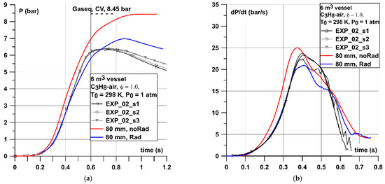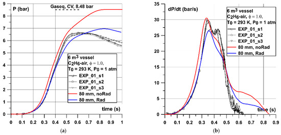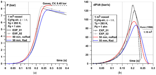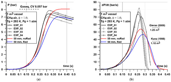 Comparing the experimental pressure histories with simulated ones in a 1 m3 vessel (Figure 9) is somehow different than in the 0.02 m3 case. The simulated pressure did not follow the experimental curve so well and underestimates the (dP/dt)max by around 30–35 bar/s (30–40%). However, the comparison with (dp/dt)max provided by Gieras [39] and Kunz [40] in vessels of similar volume and shape were very close to the value obtained numerically. Experiments shown in Figure 9 also show some discrepancies between maximum pressures achieved Pmax between 7.0 and 7.93 bar and this range was very close to the values recorded by both simulations (7.0–8.06 bar).