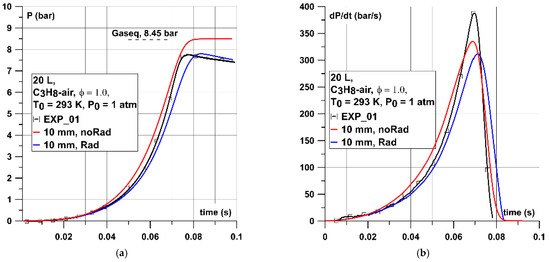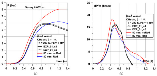Figure 8, Figure 9 and Figure 10 show the comparison between simulated and experimental pressure–time and dP/dt curves for cases with stoichiometric CH4–air mixtures. In the case of 0.02 m3 vessel (Figure 8) the experimental pressure curve was almost in line with simulated non-adiabatic one. The importance of radiation was visible as the model with radiation slightly underestimates (0.4 bar) the experimental maximum explosion pressure. However, the time to reach Pmax was very close to the experimental one. Some discrepancies close to the maximum pressure peak were due to the vicinity of the walls and higher heat losses than in experiments as the simulated pressure curve decreased faster than the experimental one after reaching the maximum pressure. As regards dP/dt curves both, adiabatic and non-adiabatic simulations underestimated the (dP/dt)max parameter by around 40 and 65 bar/s (15–25%), respectively. As the dP/dt curve was generated by differentiation of the P(t), it will express all the differences in pressure dynamics built-up. However, the numerical (dP/dt)max (206 bar/s) underestimated only slightly the value provided in European standard EN 15,967 of 235 ± 7.4 bar/s.