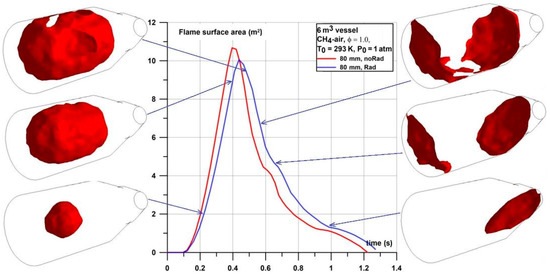 In the case of the 6 m3 vessel (Figure 10) one can observe high influence of the vessel geometry on the recorded pressures in both simulation and experiments. Firstly, in the experiment the pressure increased progressively to around 2–3 bar (until 0.45 s) and the slope stabilized at the relatively constant level of 15 bar/s (and lasts until around 0.65 s) represented by the plateau in the dP/dt graph. This layout of the pressure curve was observed independently on the flammable mixture investigated. As the dP/dt curve delivered the information about the pressure dynamics, a relatively constant value at the plateau means that the increase of the pressure was due to the relatively constant mixture consumption by the flame. An additional analysis was performed of the flame front development for this geometrical case. Details of the flame front area development at the selected times of simulations are shown in Figure 11. The flame front area was calculated as the area of iso-surface of progress variable equal to 0.5. The analysis shows that the flame front area development curve defines the dP/dt curve. Initially, flame propagates as a spherical shape but due to an interaction of pressure waves with the vessel geometry it transforms into an ellipsoidal shape. Shortly after the flame reaches the upper vessel wall the dP/dt curve reaches maximum. The following drop in flame area is due to contact with vessel walls that prevents further development of the flame area, moreover the flame is quenched by the walls. The buoyancy is observed at that time the flame does not touch the bottom wall of the vessel. In the time range 0.42–0.5 s the flame is stopped and quenched by walls and subsequently the flame transformed into two separate zones with flame propagating in the opposite directions through the unburned mixture. Then, flame surfaces start to tilt due to the buoyancy effect with respect to the horizontal direction and starts to quench at around 0.8 s at the semispherical surface of the vessel. Flame area in the narrower conical shape part of the vessel starts to tilt even more and propagates almost vertically downwards at the time of around 1.0 s. Finally, the flame quenches totally at the time of around 1.17 s or 1.25 s for cases with and without radiation model activated, respectively.