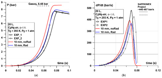 Figure 15, Figure 16 and Figure 17 show the comparison between simulated and experimental pressure–time and dP/dt curves for cases with stoichiometric C3H8–air mixtures. In the case of the 0.02 m3 vessel (Figure 15) the experimental curve was between the simulated non-adiabatic and adiabatic cases with similar underestimation of the pressure rise rate close to the maximum pressure. However, the experimental Pmax was the same (7.7 bar) as observed numerically for non-adiabatic case but the time to reach Pmax was around 10 ms longer than in the experiment. The underestimation of the (dP/dt) max was similar as observed in previous simulations with difference of around 50–70 bar/s (15–20%). In the case of the 1 m3 vessel (Figure 16) both numerical curves P(t) and dP/dt were underestimated, similarly as observed in simulations of CH4–air and C2H6–air. This characteristic underestimation of around 30–40 bar/s (25–30%) is present for all simulated mixtures in the 1 m3 vessel. However, the comparing simulated (dp/dt)max with a value provided by Kunz [40] in the vessel of a similar volume shows only slight overestimation.
