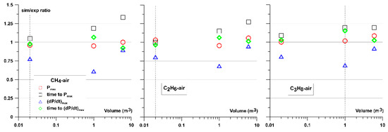 The results showed that the used deflagration model might be successfully used for closed volume combustion modeling with a satisfactory level of accuracy for a given scale of a problem. Simulations of each vessel sizes 0.02, 1, and 6 m3 gave good predictions. It should be noted that the way of generating input data for simulation, especially LBV and its dependence on temperature and pressure might introduce some level of uncertainty. There are various experimental data of the LBV. Large scatter of the experimentally obtained laminar burning velocities makes it difficult to validate kinetic mechanism especially for higher initial pressures and temperatures where very limited data is available. Considering the above mentioned issues it is expected to observe some level of discrepancy between simulated and experimental results, especially at higher pressures. To assess the simulations quantitatively the ratios between simulated (non-adiabatic) and experimental values of the main parameters characterizing constant volume combustion were calculated and summarized in Table 3: Pmax (absolute values ratio), time to reach Pmax, (dP/dt)max, and time to reach (dP/dt)max. Graphical interpretation of Table 3 is shown in Figure 19. Values less than one mean the simulation underestimates specific parameter and a value more than one means that simulation overestimates parameter with respect to the experimental value.