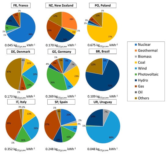 The optimization of carbon emission was performed considering nine different representative situations based on the fuel mix of the selected countries. Their differences in energy source, share, and hourly variations have been considered to cover the significant number of possible fuel mix situations in the selection process. The average fuel mix of the selected cases is shown in Figure 1. The average carbon intensity of each scenario is also shown in the same figure. Imported energy, among others, are included in the fuel mix within the label “Others”.