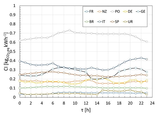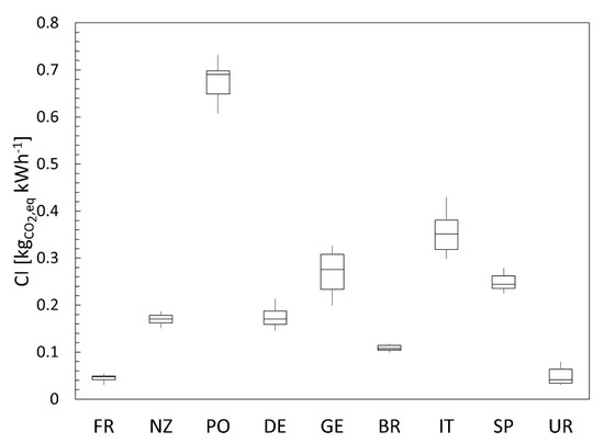 Figure 2 shows countries with noticeable electricity production from RES, such as Germany, Uruguay, Denmark, and Italy. There are other countries, Spain, Brazil, Poland, in which these variations are not evident. A statistical investigation was performed using box plots to characterize the variation of carbon intensity values over the reference day for each country (Figure 3). In Germany, France, New Zealand, and Brazil, carbon intensity values are well-distributed around the median value, but they change in a narrow range, excluding Germany.