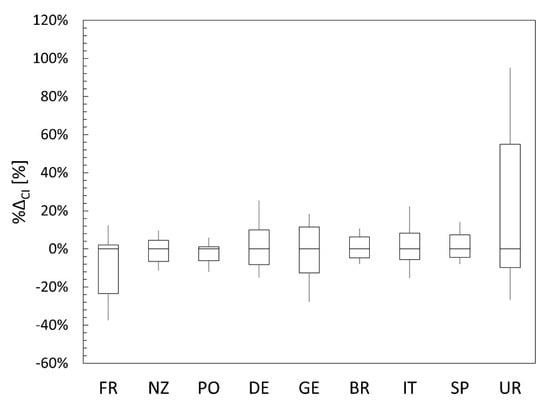 The analysis resulting from Figure 3 is fundamental to understand the percentage variation of carbon intensity values over a specified period. Then, the achievement of a carbon emission saving by applying an optimization procedure can be evaluated. In this way, Figure 4 reports the percentage variation distribution of the carbon intensity values referred to as the median value for each investigated country.