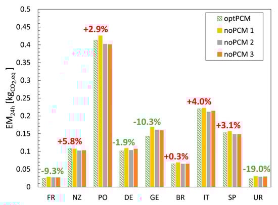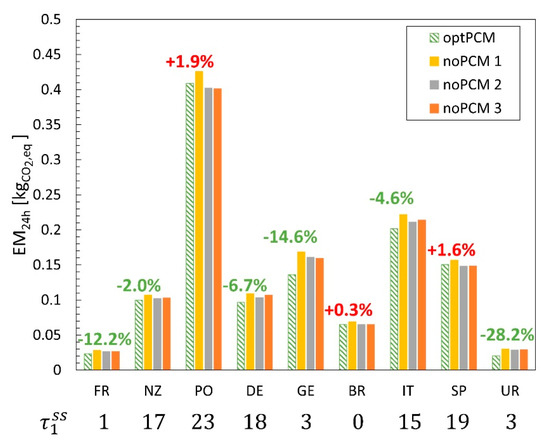 It can be noticed that a carbon emission reduction can be achieved for some representative cases, from −1.9% (Germany, GE) to −19.0% (Uruguay, UR). However, five of the nine representative cases are not positively affected by the optimization process. Despite the optimization of hysteresis scheduling, the introduction of PCM increases from +0.3% (Brazil, BR) to +5.8% (New Zealand, NZ) of the daily carbon emission. A noticeable improvement of the environmental performance of the cabinet refrigerator with PCM is achieved varying the initial condition of the optimization problem, i.e., the initial starting time of the compressor. The effect of the initial condition variation was analyzed, repeating the optimization procedure for each possible initial starting time within the time horizon. The results of the second optimization phase are shown in Figure 6.