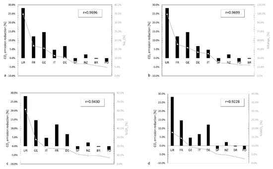 Figure 7 shows the statistical analysis results needed to identify a correlation between the carbon emission variation obtained by the optimization process and the carbon intensity profile for each representative country. The carbon emission variation is shown on the left y-axis of each plot, whereas on the right y-axis, the statistical index used to describe the carbon intensity profile is displayed. The statistical indexes are calculated using Equations (3)–(6). Furthermore, the correlation degree (r) of each statistical index with the carbon emission variation is reported on each plot.