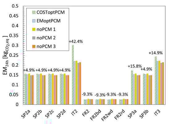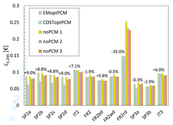 The daily running costs of the cabinet refrigerator without PCM and different fixed hysteresis (noPCM 1, noPCM 2 and noPCM3) are shown in Figure 8. This figure contains the cabinet refrigerator results with PCM working with a cost-optimized hysteresis scheduling (COSToptPCM) and working with a hysteresis scheduling optimizing daily carbon emission (EMoptPCM). In the latter case, the initial starting time was also optimized. The percentage values above each bar represent the difference between the daily running cost calculated with a hysteresis scheduling which optimizes daily carbon emission, and the minimum daily running cost obtained simulating the refrigerator without PCM with a fixed hysteresis. For further information about the labels on the x-axis, refer to Maiorino et al. [44].