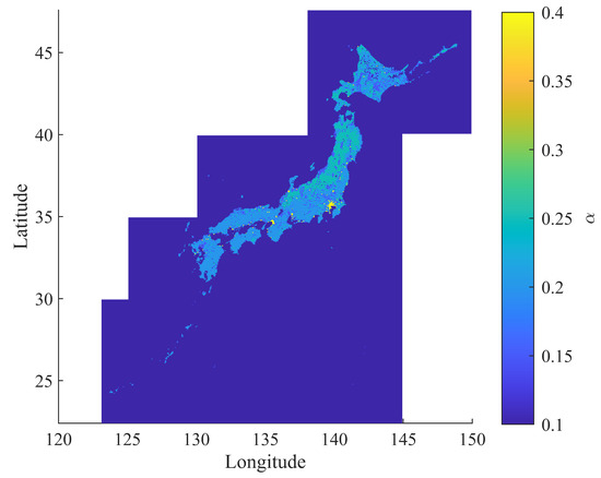 with the Hellmann exponent varying with ground terrain shape. The values used for different land cover types are summarized in Table 1 [27]. We use the land cover data provided by the Japanese Ministry of Land, Infrastructure, Transport, and Tourism [28]. values are first attributed to each land cover type according to Table 1, then converted to the wind speed data meshes coordinates using 2-dimensional linear interpolation. Figure 1 shows the resulting map. The unknown land cover regions correspond to the subtropical Ogasawara islands, which are considered for our analysis. Although the variation of Hellmann exponents is expected [27] with seasonal terrain modifications, such as deciduous trees losing their leaves or snow falls, the exponents are considered constant here.