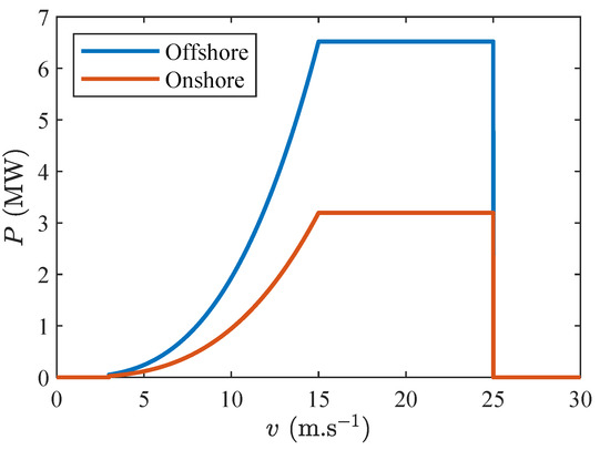 We consider different wind turbines for the onshore and offshore area, which parameters are summarized in Table 2, resulting in power curves shown in Figure 2. The rotors’ length and coefficients of performance were selected to reach realistic rated powers while keeping realistic dimensions with respect to currently commercialized onshore and offshore types wind turbine models [29,30]. The offshore area is defined as the water bodies area in the land cover data, which includes large onshore lakes (larger than 5 km).