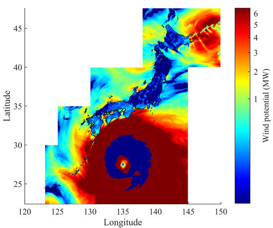 Figure 5 shows an example of the wind energy potential map on the day of 13 August 2019 at 11 a.m. with the typhoon Krosa of that year. The colors are displayed following a 1/3 power law to compensate the cubic value of wind speed in equation 3 and better distinguish zero from non-zero values. One can notice the energy potential dropping to zero between the typhoon eye and borders due to the wind speed exceeding the cut-off value of 25 m·s. The spatial–temporal evolution for 2019 is available in video format as a supplementary material.