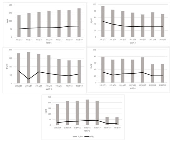 The daily per capita water production (PCWP) and per capita water consumption (PCWC) provides estimates of the average daily volume of water supplied and utilized per person in liters per person per day (L/p/d) within the jurisdiction of the WSPs. Figure 1 presents a seven-year trend of daily per capita water production and per capita water consumption for five WSPs in 2012–2019. During this period (2012–2019), WSP1 reported the highest per capita water consumption among all the WSPs. The per capita water consumption increased 5% per annum (51 in 2012/2013 to 69 L per person per day in 2018/2019). On the other hand, per capita water consumption decreased for the other four WSPs at an annual average of 7%, 6%, 10% and 21% in WSP 2, WSP3, WSP4 and WSP5, respectively. For instance, there was a decrease in the per capita water consumption in WSP2 from 48 L/p/d in 2012/2013 to 33 L/p/d in 2018/2019 and 75 L/p/d to 56 L/p/d in WSP 3 within the same period.