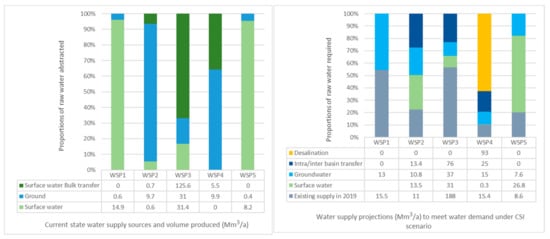 Figure 2 compares the proportions of different raw water types and volumes currently produced by each WSP and projections to meet the projected water demand under the Current State Improves (CSI) scenario. The current water production and projected estimates were used in this case as data on water sources and proportions abstracted was available.