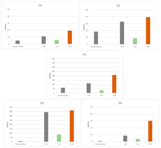 Estimates of energy intensity for water production with the three scenarios (Current State Extends (CSE), Current State Improves (CSI) and Current State Deteriorates (CSD) for 2030 compared to current energy intensity (2019). Note the difference in magnitude for energy intensity between WSP1 (a), WSP2 (b) & WSP5 (e) and WSP 3 (c) & WSP4 (d).
