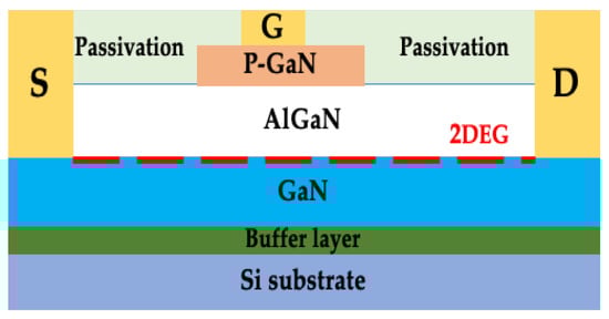 High electron mobility transistors (HEMTs) based on Gallium Nitride (GaN) are certainly becoming superior devices for high-frequency, high-voltage, and high-power applications with respect to their excellent physical properties [1] such as wide bandgap (3.4 eV), high breakdown voltage (3.3 MV/cm), and low permittivity. In addition, the GaN HEMT devices have low on-resistance [2], high power densities [3], and high breakdown voltages [4], which help design compact high-power RF and high-efficiency amplifiers [5]. Meanwhile, these excellent device performances are obtained with an AlGaN/GaN hetero-junction and the formation of a 2-dimensional electron gas (2DEG) between hetero-junctions, which has comparatively high charge density and high mobility at room temperature [6]. Moreover, these GaN power devices have an important role in power electronic applications (PEAs), which includes their usage in power adapters, battery chargers, load converters, PV, and motor drives [7,8,9]. With this wide range of applications for the GaN power electronic technology, the basic characteristic requirements such as good controllability, high efficiency, cost-effectiveness, and reliability are simultaneously increasing for power devices [10].