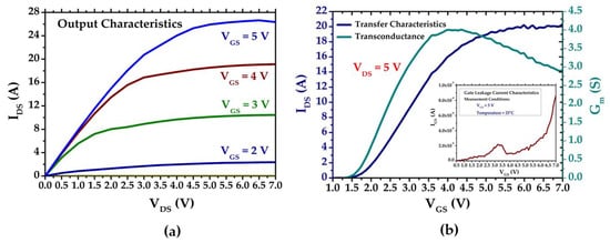 A commercially available E-mode HEMT with p-GaN gate switches (200 V breakdown voltage) was used to investigate the dynamic instability and static reliability. The device under test (DUT) made up of AlGaN barrier layer, p-GaN layer, GaN transition layer, and a GaN buffer layer is shown in the schematic diagram of p-GaN gate HEMT in Figure 1. At present, we have studied the footprint of negative gate stress conditions through the device electrical parameters defined in the linear and saturation operating regions at VDS = 3 V. We focus our interest on the stability of VTH, increase of RDS-ON, degradation of Gm, max, and IGS-Leakage. A fresh device is used in this study to exhibit electrical characteristics, which includes output characteristics (IDS-VDS), transfer characteristics (IDS-VGS), and gate leakage characteristics (IGS-Leakage-VGS) before the negative gate (VGS) stress conditions, which are shown in Figure 2a,b. Thermally stable values of VTH = 1.6 V (observed at linear region of IDS = 0.05 A), RDS-ON = 25 mΩ (observed at saturation region of IDS, Max with VDS = 3 V and VGS = 6 V), Gm, max =1.5 S (defined at VDS = 3 V) and IGS, Leakage versus VGS characteristics (observed at VDS = 3 V and VGS from 0 V to 6 V) are confirmed with the data sheet. Further, fresh devices are put through to an extensive study of trapping or detrapping effect analysis under negative VGS bias stress at room temperature. All double-pulsed and prolonged VGS bias stress experiments were done with the Keithley 2651 A and 2601 A source meter systems.