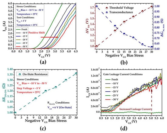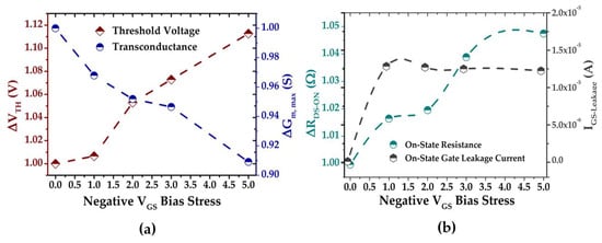 Figure 4a shows the extracted △VTH and △Gm, max for different pulsed negative VGS bias stress (VGS bias = −1 V to −5 V & VDS = 3 V, room temperature) according to the preliminary data sheet standards. △RDS-ON and IGS-Leakage were extracted and shown in Figure 4b. The degradation parameters △VTH, △Gm, max, and △RDS-ON are normalized values of VTH, Gm, max, and RDS-ON (defined at VTH stress/VTH fresh), respectively. The transfer characteristics curve shifts in the positive direction with minimal significance under the low-voltage stress conditions, which results in an increase in the △VTH from 1 V to 1.11 V with respect to change in stress voltage. At the same time, the △Gm, max of the device decreases from 1 S to 0.90 S and △RDS-ON increases from 1 Ω to 1.04 Ω. Overall, the p-GaN gate HEMT, under the low stress voltage condition, show negligible and easily recoverable degradation at room temperature.