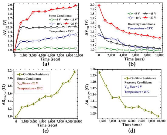 Extracted (a) △VTH shift under stress conditions, (b) △VTH recovery under room temperature, (c) extracted △RDS-ON degradation under stress conditions, and (d) △RDS-ON recovery under room temperature.