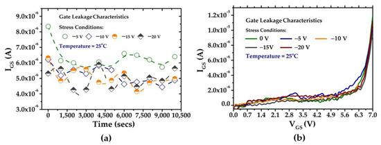 Figure 6a,b shows the extracted normalized △VTH shift and recovery, and Figure 6c,d shows the extracted normalized △RDS-ON degradation and recovery. The instability of VTH and degradation of RDS-ON are very minimal and fully recoverable at −5 V stress conditions. Further, these two electrical parameters are shown to be increasing as the magnitude of negative VGS bias stress increases. However, with increasing stress time, the device shows a gradual increase in △RDS-ON and the saturation of VTH degradation at each stress bias. In this, the △VTH initially shows the strong increase from 1 V to 1.6 V after 103 s stress and further increased minimal from 1.6 V to 1.98 V after 103 s to 104 s stress under a −20 V stress condition. The rapid increase in VTH at beginning shows the device’s strong dependence on stress voltage over stress time. At such a high stress voltage condition, the device does not show full recovery under room temperature compared to other stress voltage conditions. Similarly, the conductivity of the device is strongly affected by high stress condition, whereas the △RDS-ON increased from 1 Ω to 2.17 Ω within 104 s of stress. The △RDS-ON of the device shows full recovery under room temperature, which is shown in Figure 6d. The influence of stress time evolution on the gate leakage characteristics under mid/high prolonged negative VGS bias stresses is shown in the Figure 7a. Figure 7b shows the influence of stress voltage on IGS-Leakage versus gate bias with VDS = 3 V at room temperature. The gate current leakage over stress time for various stress voltages reveals that the IGS-Leakage has no changes with respect to increase in stress time. Further, a very minimal and negligible increase in the IGS-Leakage versus gate bias for various stress voltages is shown in Figure 7b. The pulsed negative VGS bias stress shows the strong impact on the device IGS-Leakage compared to the prolonged stress conditions.