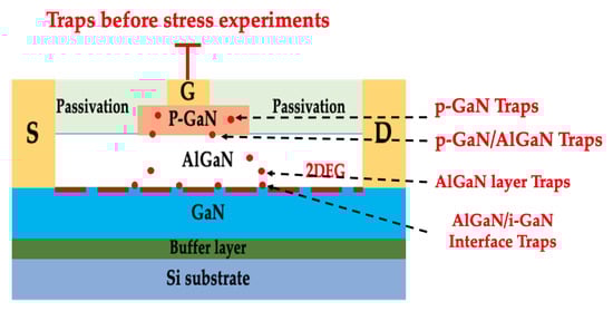 The GaN-based HEMT device holds several kinds of traps, which exist in the p-GaN region, the AlGaN barrier layer of the device, and the hetero-structure interface [35,36], such as Ga vacancy (VGa), Ga-N divacancy (VGa-VN) or oxygen impurity centers (ON), gallium antisite (NGa), or N vacancy (VN) [37]. Figure 8 shows the schematic p-GaN gate HEMT device diagram with trap states before stress conditions. According to the degraded electrical parameters under the negative VGS bias stress conditions in the p-GaN gate device, the degradation mechanisms are significantly influenced by trapping process under the gate region. The keen degradation and instabilities of electrical parameters under negative gate bias stress take place at room temperature, which could to be caused by hole deficiency and p-GaN/AlGAN interface traps. Therefore, the p-GaN gate-modeled HEMT structure is further subjected to in detail investigation for the above-mentioned device degradation mechanisms.