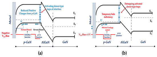 The physical mechanism behind the degradation effects for pulsed and prolonged VGS bias stress on the p-GaN gate HEMT is explained in the Figure 9a,b. In view of the Schottky gate contact of the studied device, where the metal/p-GaN hetero-structure acts as Schottky junction diode and the p-GaN/AlGaN/GaN structure acts as p-i-n junction diode, and respective junction capacitances [38,39]. Under negative gate bias, the JSchottky is forward biased, with small voltage drop on it. The p-i-n junction has reverse bias under negative gate bias stress, and all the voltage drops on the p-i-n junction (p-GaN/AlGaN/GaN). A small depletion takes place under stress conditions, where p-GaN is nearby the barrier layer AlGaN. As a result, the removal of holes flows from the depletion region in p-GaN to the gate region, and the p-i-n junction capacitor is charged which is shown in Figure 9a. Some of the donor-type holes at the p-GaN/AlGaN interface trao state also released under this charge process. When the gate bias switched to the positive level, the reduced charges at the p-GaN and interface of p-GaN/AlGaN are not immediately restored, which plays a strong role in the positive shift of threshold voltage (VTH), increase of on-state resistance (RDS-ON), and degradation of transconductance (Gm, max). As the magnitude of stress voltage is increased, the high order of hole deficiency takes place in the strong instability and degradations. As the stress time increases, the formation of the built-in electric potential by ionizing the donor-type holes will reduce the holes’ deficiency from the trap state, which leads to the saturation of the VTH shift degradation degree. Under the negative gate bias stress condition, the release of donor type holes from the p-GaN/AlGaN interface trap state by the reverse biased p-i-n junction capacitor charge process is not modulated due to the lack of an electron injection or recombination process under VGS stress bias. Meanwhile, the acceptor-like traps at the AlGaN/i-GaN interface and the buffer layer are also very difficult to activate as the electric potential is very low at buffer layer and the drain bias is zero during negative gate bias stress. At this point, detrapping the activated donor-type traps from the interface (p-GaN/AlGaN) and holes from gate region could primarily influence the electrical parameters degradation and instabilities. If the gate bias increases more negative, the number of released holes from the p-GaN and p-GaN/AlGaN trap state will be increased, which results in more significant degradations and instabilities. This agrees with the results shown in both pulsed and prolonged negative gate bias stress experiment as shown in the Figure 5 and Figure 6.