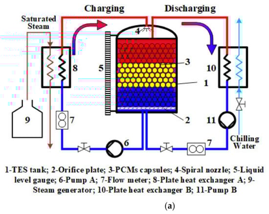 Many investigators focus on the dynamic performance of a thermocline tank by incorporating the phase change materials as part of the storage medium, due to its merits of high energy storage density and the temperature stability of the heat storage phase [9,10]. The results reported that the adoption of PCMs in water storage tanks utilized for domestic hot-water supply is a favorable technique. Besides, the thermal stratification analysis of a water tank with and without PCM as filler material was experimentally investigated [11]. The heat exchange mechanisms between PCM capsules and the heat transfer fluid (HTF) were discussed at different locations over the packed-bed height and within a certain PCM capsule [12,13]. Nallusamy et al. [14] experimentally investigated the effects of the inlet fluid temperature and the flow rates on the dynamic performance of a hybrid thermal storage unit incorporated with fixed and varying heat sources. The major findings of these studies revealed that the use of PCM as a storage medium has significant effects on dynamic performance characteristics, such as thermal stratification [15], the heat storage/release rate [16]. Most recently, the dynamic performance of a water thermocline tank filled with encapsulated paraffin wax as a PCM was experimentally investigated under various modes of operation, i.e., cyclic operation [17] and simultaneous operation [18]. The results indicated that the cut-off temperatures of charging and discharging and the flow rate mixing ratio are good performance parameters for predicting the dynamic behavior.