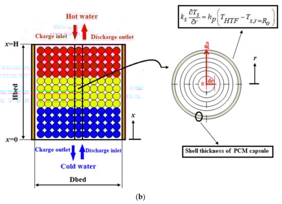 (a) Schematic diagram of the packed-bed TES system employed in CHP units [15], (b) Numerical domain of concentric-dispersion model.