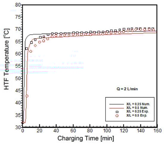 Validation of numerical model with experimental results during the charging process [14]. Validation was performed under a charging inlet HTF temperature of 70 , a discharging temperature of 32 , a charging water flow rate of 2 l/min, a capsule size of 0.052 m, and a bed porosity of 0.5.