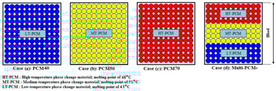 This part presents comprehensive comparisons between single-PCM and multiple-PCMs-TES systems throughout temperature distribution maps and dynamic performance analysis. Four different cases under study are presented as shown in Figure 3. In the first three cases, the tank is filled with a single-layer PCM of different properties, while the fourth one is filled with multi-layer PCMs arranged from high, medium, and low melting points from top to bottom of the tank.
