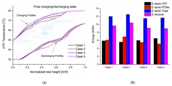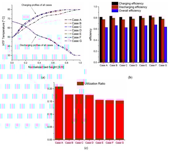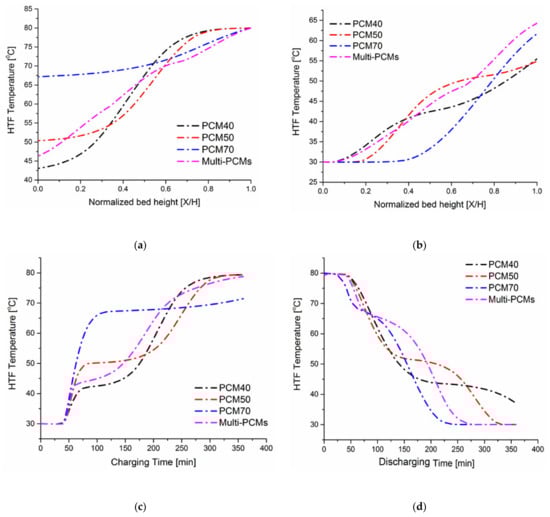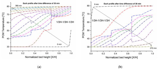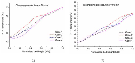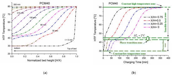 Figure 4 shows comprehensive HTF temperature field profiles of the case (a) during the charging phase in which the storage tank is packed with PCM40. Figure 4a shows axial temperature distribution plotted against the normalized bed height (X/H) at different time instants. The initial temperature of the confined HTF and PCM capsules inside the tank is kept at a cold water temperature of 30 (fully discharged state). When t = 0 min, hot water enters the tank at its top (X/H = 1) with a temperature of 80 , which contributes to the heat transfer mechanism between the hot water and the cold paraffin wax (solid phase) stored in capsules. The incoming hot water melts the paraffin wax within capsules. It is observed that when t = 300 min, the TES system is completely charged and reaches the inlet temperature of the hot water. The axial temperature profile consists of five zones, including (1) a constant-low temperature zone that is formed at the bed exit (X/H = 0), (2) a constant-high temperature zone that is formed at the bed exit (X/H = 1), (3) a thermocline zone (a sensible heat zone below the phase change temperature) in which the heat is transferred from the water to the packed bed, and (4) a phase transition zone in which the PCM melting process occurs, and (5) a sensible heat above the phase change temperature which is characterized by significant temperature changes in solid temperature which indicated that the heat transfer rate between solid and fluid is very fast and the thermal energy stored in flowing water can be effectively transferred to the packed bed. In constant temperature zones, the water and PCM fillers packed in the tank are in thermal equilibrium; in a thermocline zone, there is a sensible heat transfer from hot water to the PCM fillers; in a phase transition zone, a latent heat transfer between hot water and PCM capsules occurs.