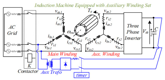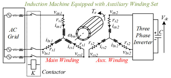 Despite the wide variety of electric motors available on the market, low- and medium-power three-phase direct online induction motors (DOL-IM) are by far the most dominant in the industrial sector, providing a wide variety of constant speeds and variable load applications where dynamic response requirements are not critical, such as pumps, fans, and compressors. Affordability, durability, easy functioning, and easy maintenance are some of the major factors driving the ever-increasing demand for induction motors. High-efficiency DOL-IMs [1] in industrial applications provide a significant reduction in energy consumption and environmental impact; however, they are still burdened by a low power factor (PF) at partial loads, which can be only mitigated by adding power factor correction capacitors. Moreover, large in-rush current is very commonly generated at start-up, leading to voltage dip, speed loss, torque pulsations, and possible activation of protection devices. A wide diffusion of variable speed drives (VSDs), featuring either torque or speed control, has been experienced in the past thirty years due to the advances in power electronics technology and control strategies, which have allowed an increase in the efficiency and reliability of electric drives [1,2,3,4]. Suitable Pulse Width Modulation (PWM) strategies have been developed that are able to cope with adverse effects related to shaft voltages, bearing currents, motor insulation breakdown, and electromagnetic interference (EMI) issues [5,6,7,8,9,10,11]. However, despite clear advantages achieved in terms of efficiency, induction motor drives are much more expensive than DOL-IMs, leading to the development of some intermediate or hybrid solutions. One of these solutions is represented by direct online double-winding IMs (DOL DWIM) [12,13,14]. They were proposed to overcome some typical drawbacks of conventional induction motors, mainly poor efficiency and power factor, by exploiting a partial power converter, which means an inverter rated at only a fraction of the motor rated power, cutting the cost. According to the DOL-DWIM approach, a special induction machine is used, encompassing two full sets of stator windings: one being directly connected to the grid and a second one being fed by an inverter supplied through a floating capacitor [12,13,14,15,16,17]. According to the basic DOL-DWIM configuration, the two winding sets feature the same number of turns; thus, the inverter supplying the second set is rated at the grid voltage, although at remarkably lower power. DOL-DWIMs are generally managed by simple control algorithms, mainly developed in order to control the PF under sinusoidal steady state operation [12,13,14,15,16,17].