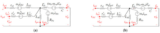 where , and , are the stator voltages and fluxes of the two winding sets, separately; and are the rotor voltages and fluxes, respectively; , and are the rotor and stator resistances, respectively; is the mutual inductance; and , , and are the rotor and stator leakage inductances. All electrical quantities of the auxiliary winding set are referred to in the main stator winding. Moreover, , where is the angular rotor speed and pp is the number of pole pairs. The equivalent circuit of the DWIM is depicted in Figure 2.