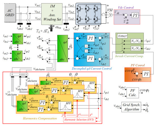 The outline of this paper is as follows: First, the modeling of the electromechanical system is presented in Section 2, and the control strategy implemented in the auxiliary winding set is described in detail in Section 3. Thereafter, the capability of the combined multi-winding sets motor, floating capacitor inverter, and control strategy to efficiently control the power factor PF, mitigate the detrimental effects related to distorted main grid voltages and mechanical torque vibrations, and reduce the large inrush current driven by the induction motor during the starting period is thoroughly investigated in Section 4. Finally, the conclusions are stated in the last section.