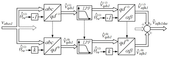 The control system driving the floating capacitor inverter is mainly based on a standard vector control approach approximating a stator flux orientation, which is achieved by transforming the three-phase utility voltages abc into a reference frame synchronous with the grid voltage vector phase . The last quantity can be determined with one of the well-known grid synchronization algorithms available in the literature [27,28]. In this work, a decoupling algorithm was exploited to remove all of the unwanted harmonic components from the measured voltages in order to keep the phase-locked loop (PLL) locked to fundamental harmonic, positive-sequence component at all times [29]. The block diagram of the grid synchronization algorithm based on a multi-harmonic synchronous reference frame (SRF) filtering (MSF) structure is shown in Figure 4. The basic idea is to estimate each voltage harmonic set by applying a low-pass filtering after a reference frame transformation synchronous with the corresponding harmonic frequency.
