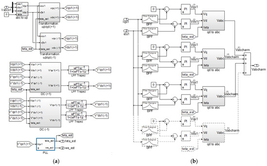 Simulink block diagram of the: (a) MSF algorithm and (b) harmonics compensation.