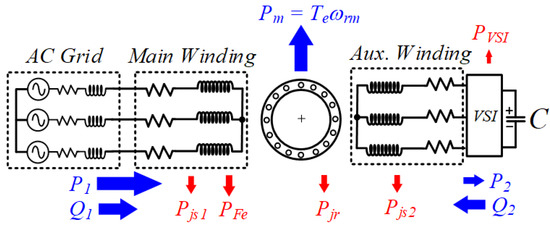 The machine active and reactive powers are functions of auxiliary winding currents and , which can be managed to control the PF under different load conditions. By neglecting the voltage drop due to stator resistances and leakage inductances, the active and reactive power generated by the auxiliary winding can be expressed as: