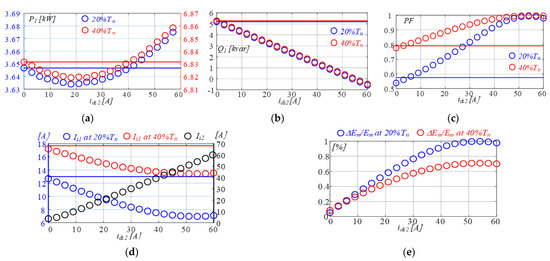 (a) Active and reactive power (P1 and Q1, respectively), (b) power factor PF, (c) main winding current magnitude Is1, (d) auxiliary winding current magnitude Is2, (e) p.u. back-electromotive force (EMF) variation ΔEm, computed at 20% and 40% of rated torque Tn for different values of ids2 (solid lines—standard IM; circles—DWIM).