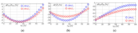 (a) Total loss variation in p.u. ΔPloss, (b) joule losses variation in p.u. ΔPj, and (c) iron losses variation in p.u. ΔPFe, vs. ids2, computed at 20% and 40% of rated torque Tn. Joule PJ and iron PFe losses referring to the single-winding IM are the points displayed in the three graphs at ids2 = 0.