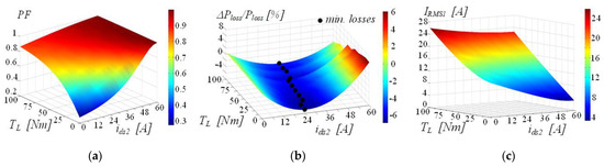 The proposed approach can lead to a reduction in the active power absorbed by the DWIM at partial load, leading to an efficiency improvement. This result is confirmed by the analysis summarized in Figure 9, where the iron and total Joule losses are computed for the standard single-winding IM configuration and the considered DWIM as a function of the current . In particular, Figure 9 displays the difference between the standard IM and DWIM total Joule losses (stator and rotor) and iron losses , with both motors operating under the same loads. The joule and iron losses referring to the single-winding IM are the points displayed in the three graphs at . Notably, in DWIM, by increasing , iron losses rise and total joule losses initially drop and then rise. Thus, by suitably selecting , the balance between iron losses increase and joule losses drop may lead to a neat reduction in total power losses and to a higher efficiency compared with the conventional IM. This beneficial result is strictly related to the motor design, load condition, and desired power factor PF. If we assume to operate the DWIM at PF = 0.9, thus requiring (Figure 8c) and a load equal to , a total loss reduction equal to 3% can be achieved compared with the standard IM configuration. On the contrary, the same DWIM operated at PF = 0.9 and a load equal to , will require a , yielding a ΔPloss/Ploss less than 0.8%, significantly reducing the efficiency improvement of the DWIM. The implementation of a losses minimization algorithm is not the focus of the paper, and more details on how to approach this aspect can be found in [30].