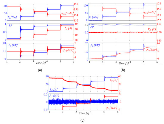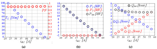 According to Figure 10b, for a given load condition, negative losses can be achieved by suitably selecting , leading to higher efficiency compared with the standard IM. Figure 11 deals with some results obtained by holding the PF at 0.9 by means of the control system. As shown, under constant PF operation, and the reactive power decrease when decreasing the load torque and the absorbed active power. Moreover, only a small active power is transferred from the grid to the auxiliary winding. Finally, both the active power and reactive power are changed by the controller in order to keep the power factor constant. The power handled by the auxiliary winding in the worst-case scenario, i.e., a very light load, is roughly one-fifth of the standard IM rated power.
