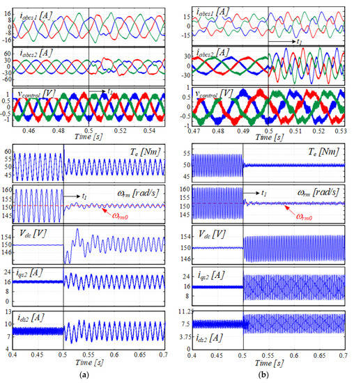 Simulation results: (a) compensation of ωrm with ΔTL = 20 Nm; (b) compensation of ωrm with Vabc5th = 30 V.