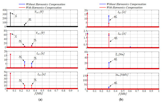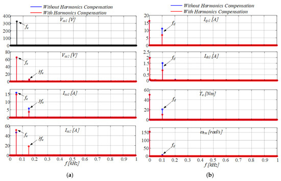 Harmonic content of motor quantities with and without the harmonic compensation when a sinusoidal torque disturbance is applied to the shaft: (a) main winding phase stator amplitude voltage Vas1, auxiliary winding phase stator voltage amplitude Vas2, main winding phase stator amplitude current Ias1, auxiliary winding phase stator amplitude current Ias2; (b) qd-axes main winding stator current Iqs1 and Ids1, electromagnetic torque Te, mechanical speed ωrm.