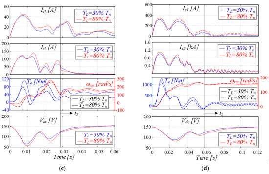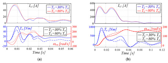 Dynamic transients under different torque load TL conditions: (a) in standard IM configuration and (b,c) in the proposed DWIM configuration.