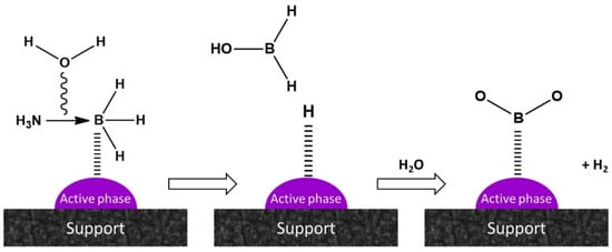 It is worth mentioning that despite the intense efforts devoted to unveiling the mechanism of the hydrolytic dehydrogenation of ammonia borane, there are still some aspects that remain unclear (e.g., rate-determining steps, the order of bond cleavages, etc.) [64]. For instance, Xu et al. postulated that the interaction between AB molecules and the surface of the metal active phase gives rise to the formation of activated complex species, which are attacked by a molecule of H2O, leading to the concerted dissociation of the B-N bond and the hydrolysis of the BH3 intermediate to form BO2, releasing H2 [65]. Fu et al. proposed a mechanism that proceeds via an almost self-powered process that involves the formation of BH3OH− and NH4+, followed by the attack of adjacent H2O to generate H2 [66]. Na et al. suggested that the mechanism is very similar to that of the hydrolytic dehydrogenation of sodium borohydride, and proceeds via dissociative adsorption of ammonia borane on Ru surface [67]. More recently, Liu et al. claimed that the hydrogen production from AB attained by noble metal catalysts occurs via the following steps: (1) AB molecules interact with the surface of the catalyst to form a complex; (2) A molecule of H2O attacks to AB-catalyst complex; and (3) AB and H2O each lose a hydrogen atom to form H2. Such a mechanism is illustrated in Figure 2 [63].